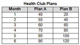 A local health club offers two different membership plans. Plan A costs $30 plus $10 per month. Plan B costs $20 per month. The table below shows the total cost of each plan for 6 months.